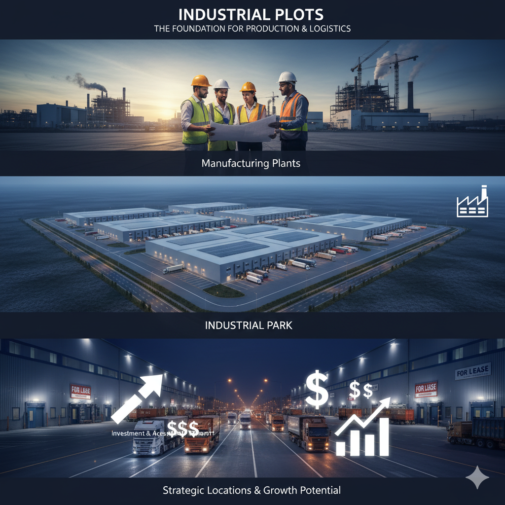 An industrial plot is land specifically zoned for industrial purposes. This includes setting up factories, manufacturing plants, warehouses, and logistics hubs. These are usually located in designated industrial parks or on the outskirts of a city, with good access to transport and utilities.